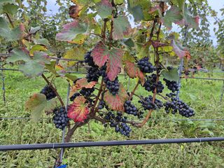 Carillon hat kleine, eher kompakte Trauben. Die Beeren sind sehr hart und daher nicht anfällig für Botrytis. Auch die Kirschessigfliege (KEF) scheint sie nicht zu mögen. Die Blattfärbung ist auffallend, leuchtendes, dunkles grün.
